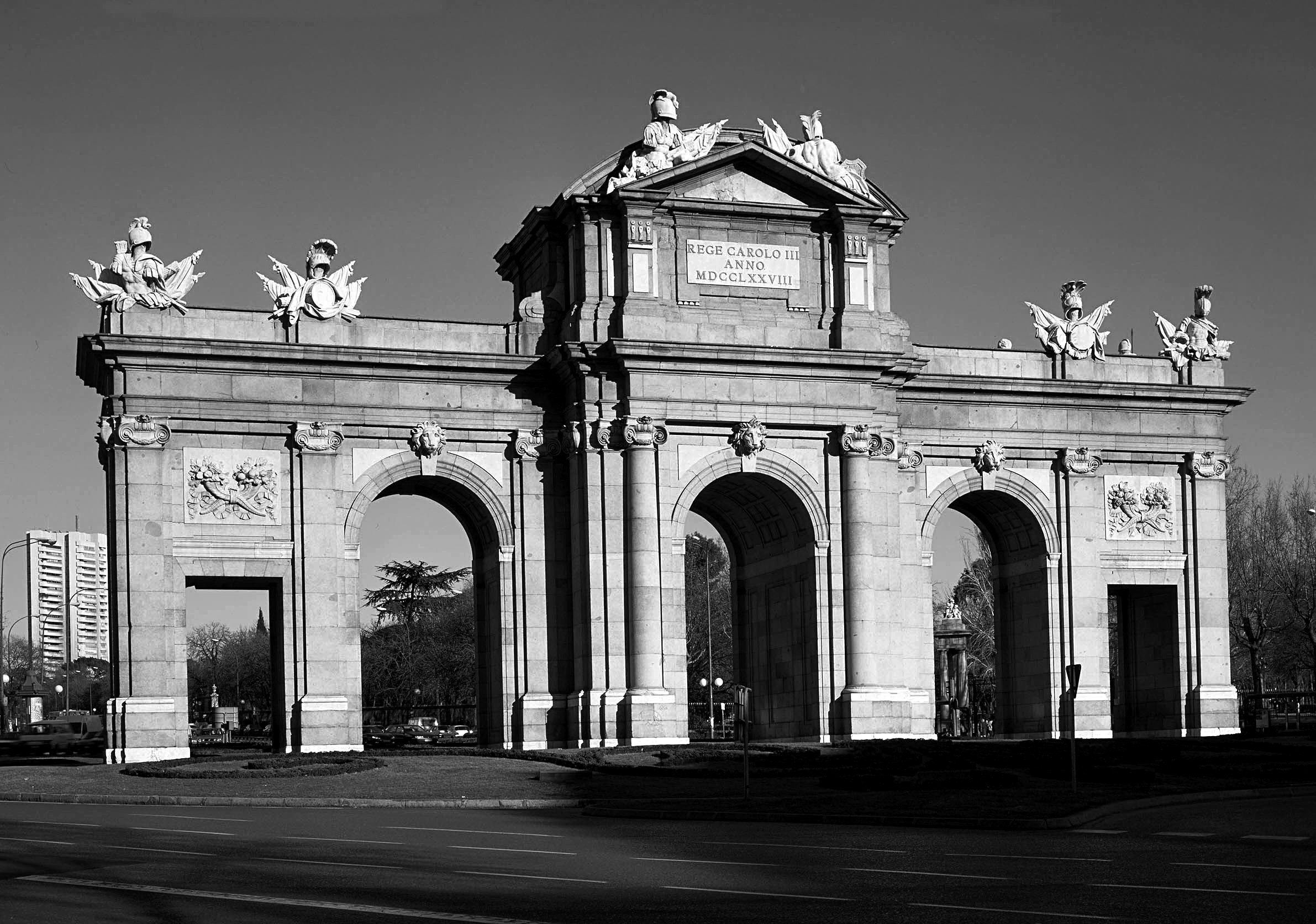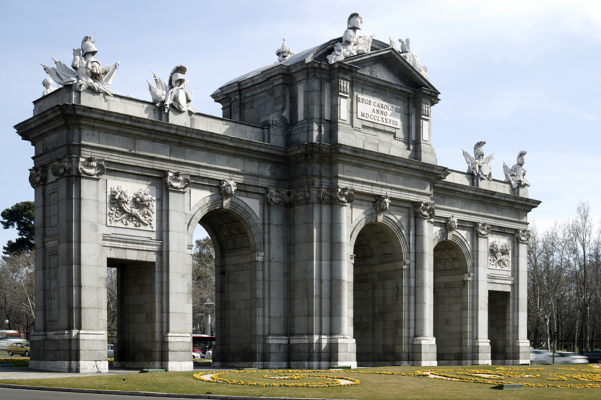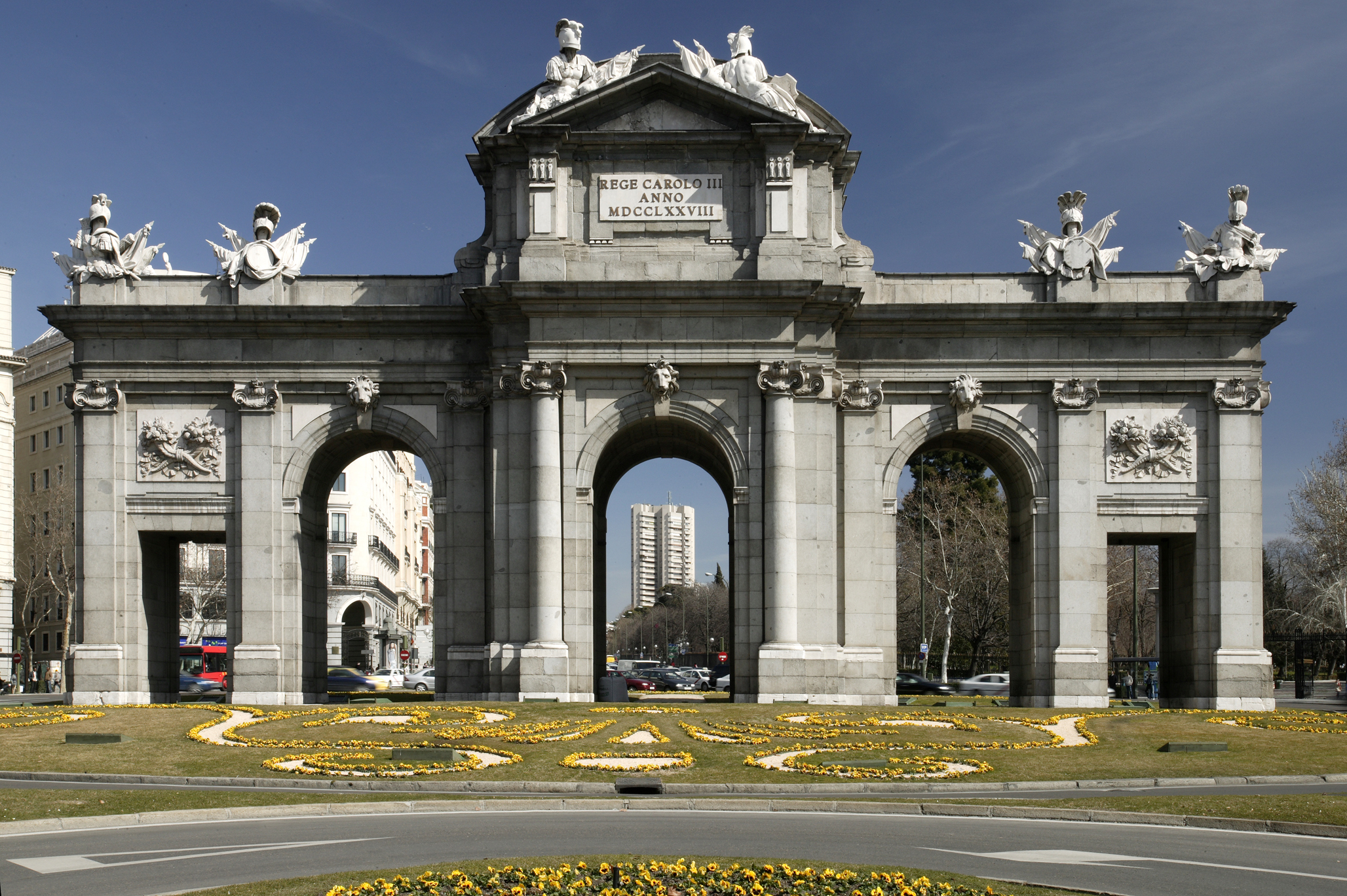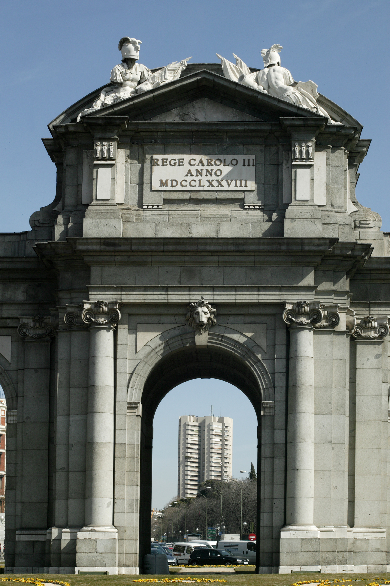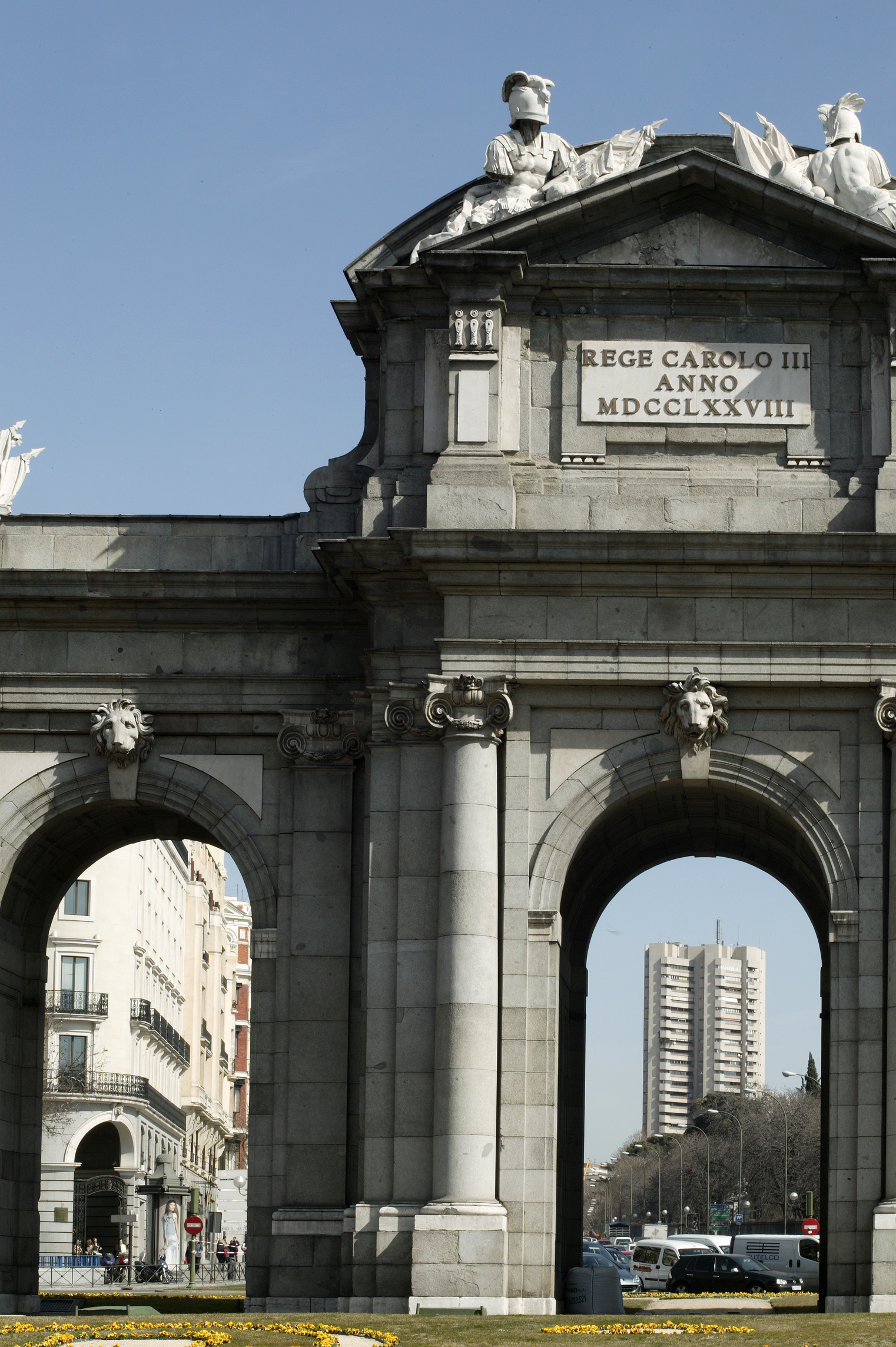 Enmarcada dentro de las reformas de embellecimiento de la ciudad promovidas por Carlos III, y concretamente de la gran operación urbana del Salón del Prado, se realizó esta nueva Puerta de Alcalá o entrada principal a la Corte, con el fin de sustituir a la antigua, construida en 1599 con motivo de la llegada de la reina Margarita de Austria, esposa de Felipe III. Para la redacción del proyecto se convocó un concurso al que fueron invitados a participar José de Hermosilla, Ventura Rodríguez y Sabatini, resultando elegidas las dos propuestas de este último, quien finalmente desarrolló una síntesis de ambas. Concebida como un gran arco triunfal dentro del barroco clasicista, está organizada por un cuerpo de cinco arcos, siendo los tres centrales de medio punto, y los dos laterales más pequeños y adintelados, de uso peatonal. Sobre el arco central hay un ático coronado por un frontón triangular en una fachada y semicircular en la contraria, partido con las armas reales. Se apoya sobre un zócalo del que nacen diez semicolumnas en una de las fachadas, y 10 pilastras en la contraria, más dos semicolumnas de orden jónico, coronadas con capiteles de cabezas monstruosas. De líneas sencillas y armónicas, fue construida con materiales tradicionales como el granito de Segovia para la arquitectura y piedra de Colmenar para los motivos decorativos obra de los escultores Roberto Michel y Francisco Gutiérrez.