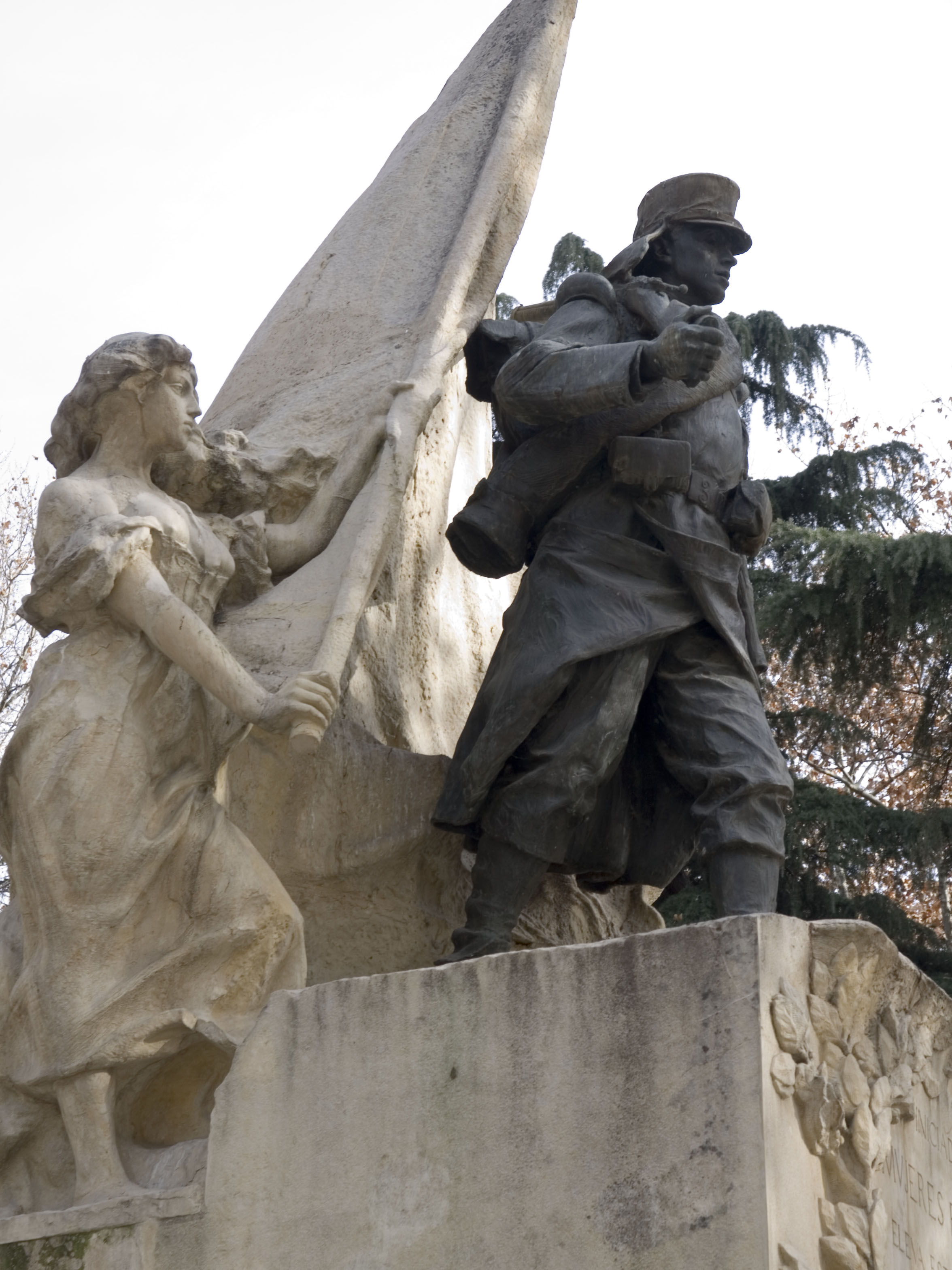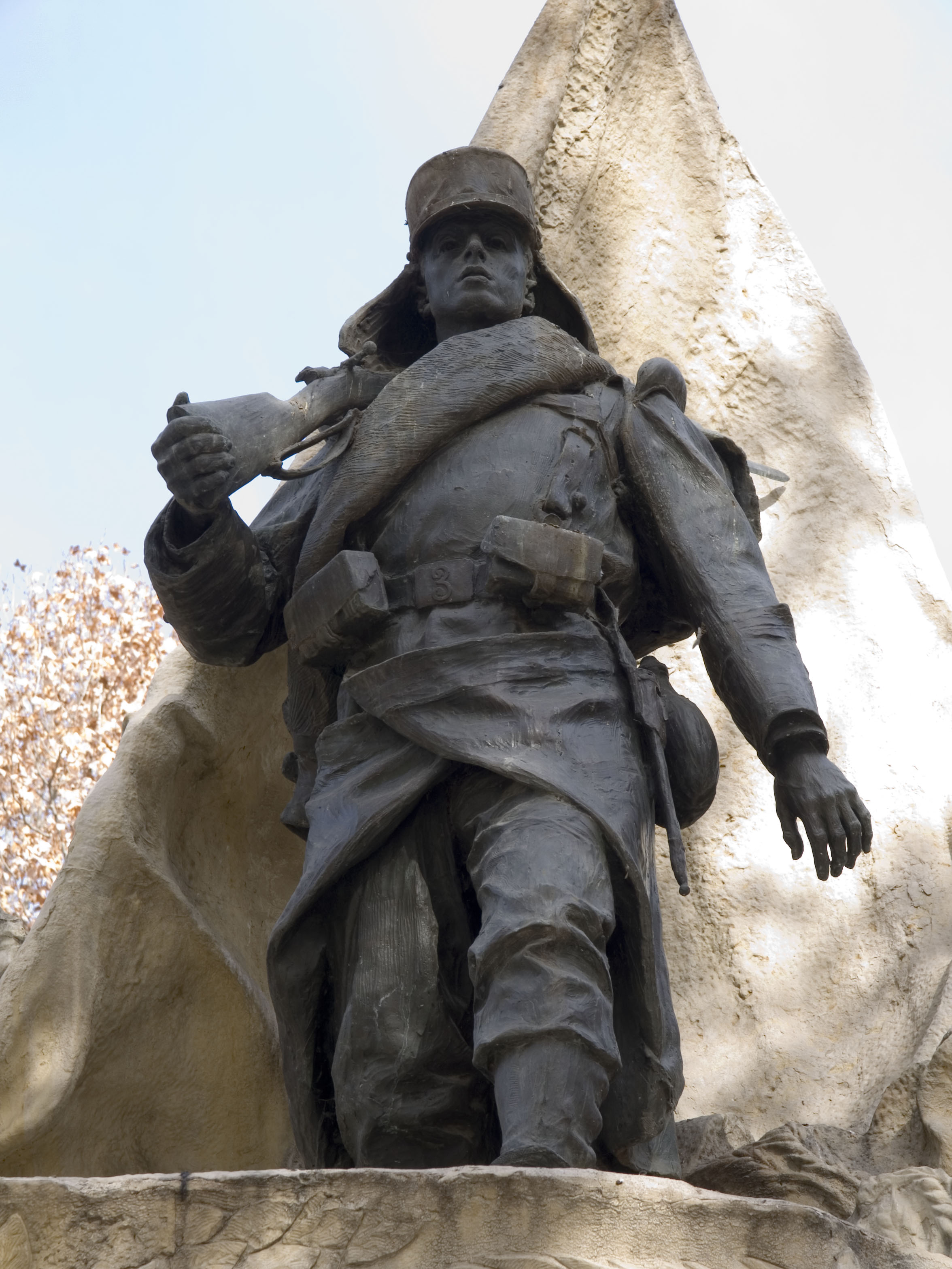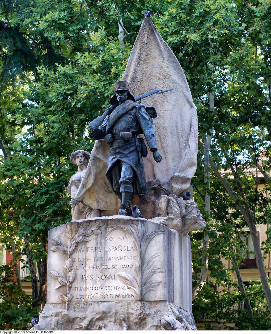 Figura del cabo Noval, en pie, en actitud de caminar hacia el campo de batalla, está representado con rostro enérgico y tranquilo. Va vestido con traje de campaña, con el mosquetón al hombro y la manta enrollada en torno al pecho. Del cinturón, con el número 3 de su regimiento marcado en la hebilla, cuelgan unas grandes cartucheras, un puñal y la cantimplora; el capote aparece medio doblado y sujeto bajo el cinturón. Le sirve de fondo una gran bandera española desplegada con el Escudo del reino en el centro, sostenida por una figura femenina, como alegoría de la Patria, que sube por unos peldaños atraída por el soldado.