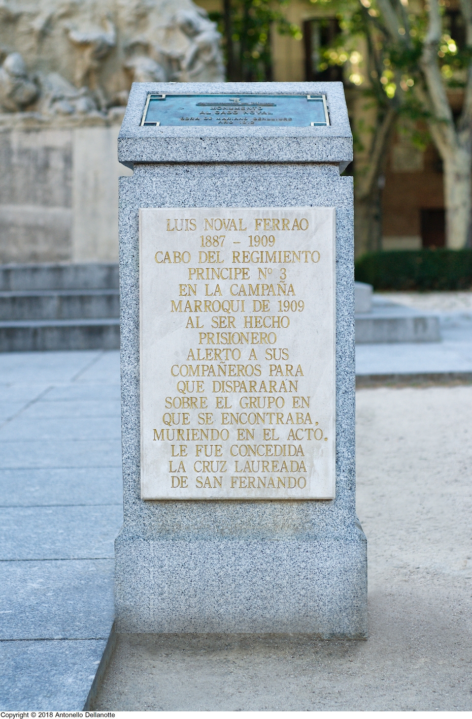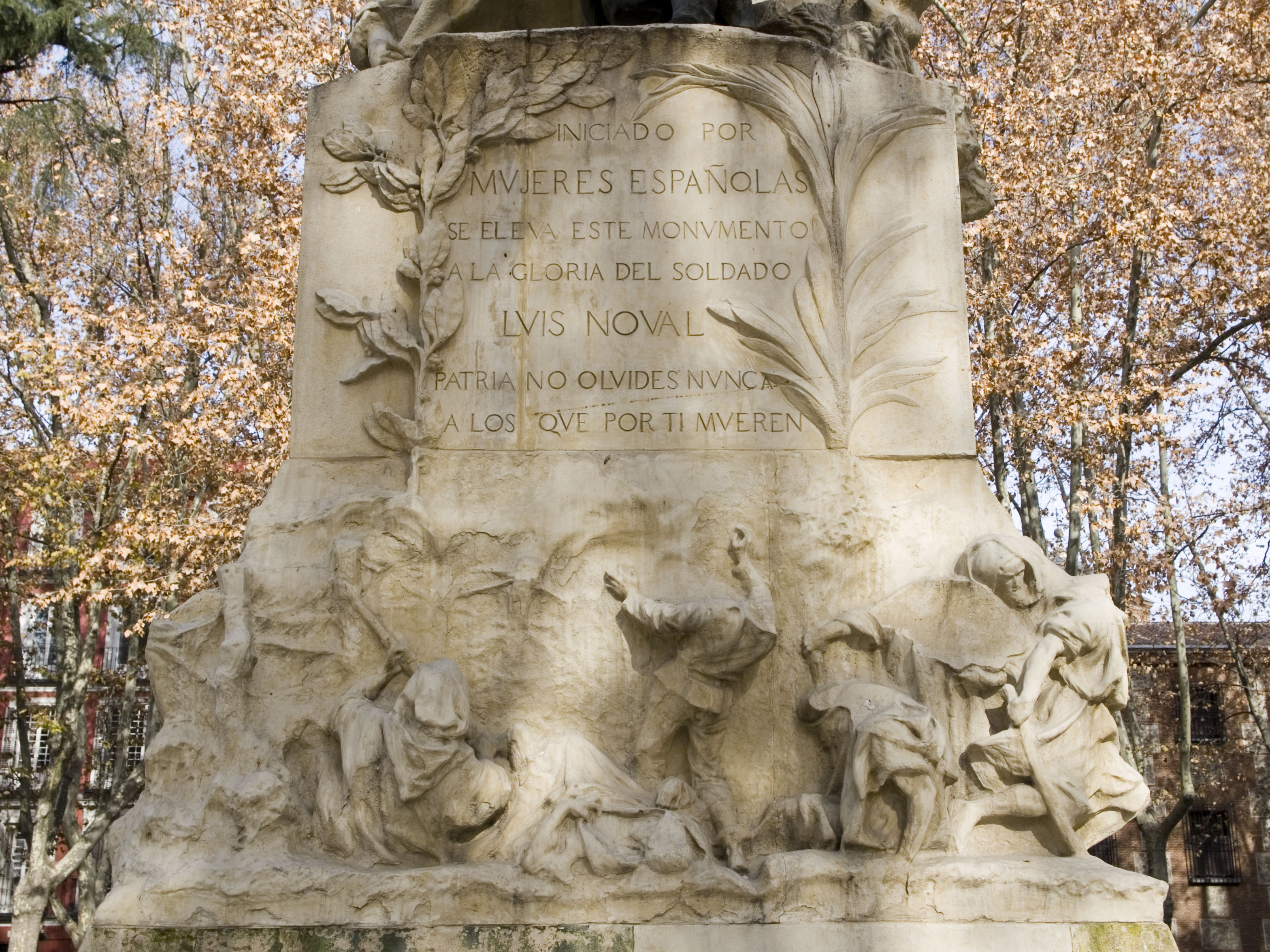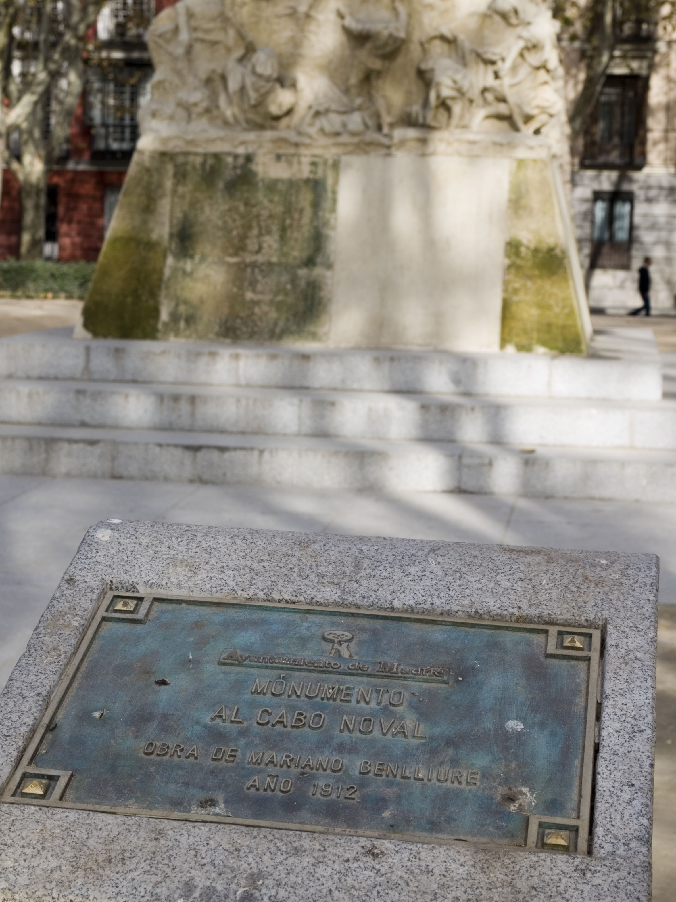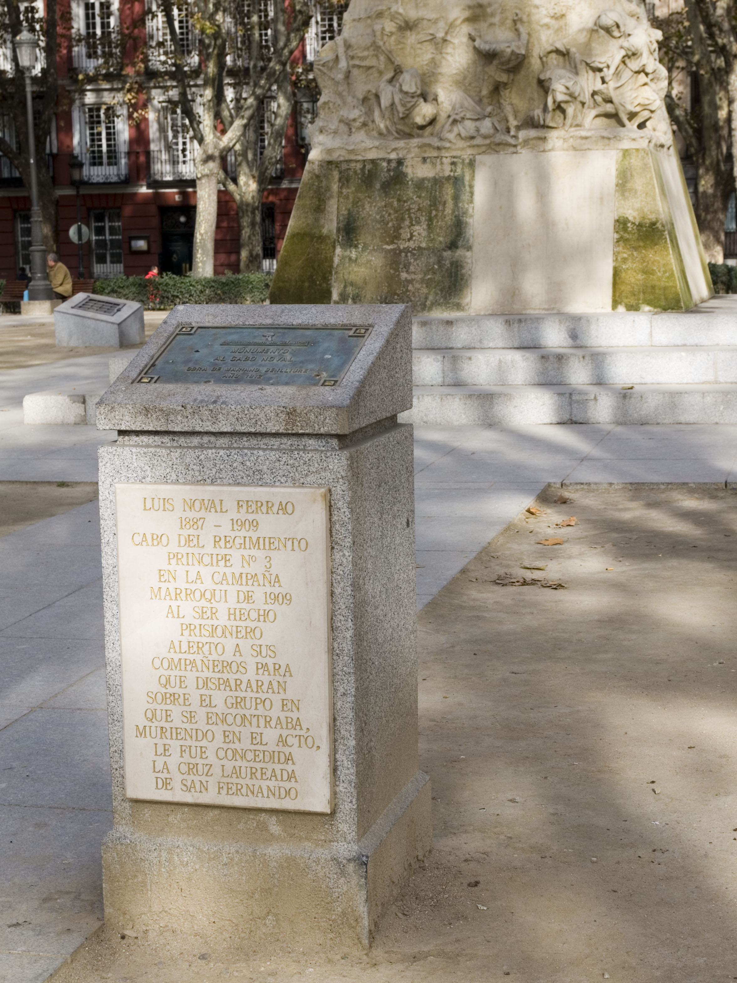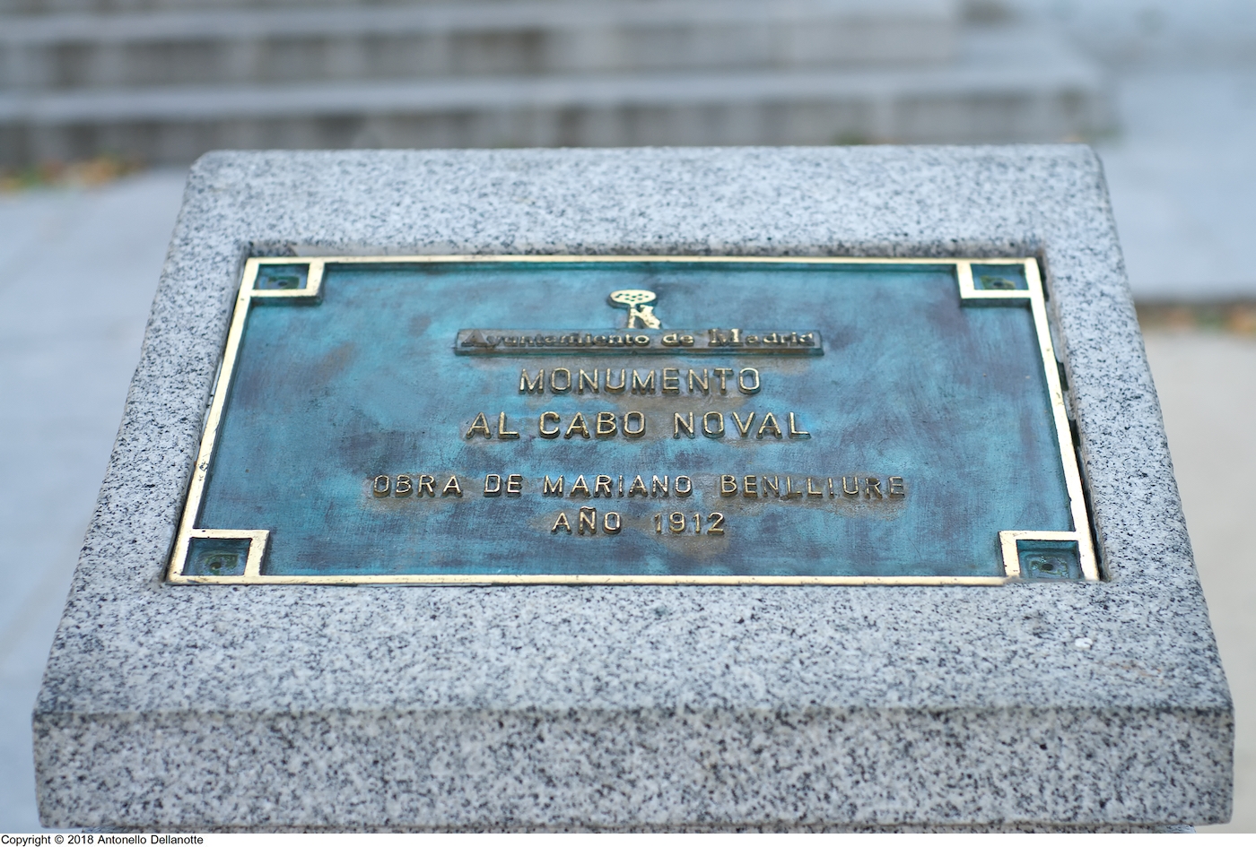 Otros componentes | Monolito, de granito Inscripción sobre placa de bronce en la parte superior: Escudo de Madrid / Ayuntamiento de Madrid / MONUMENTO / AL CABO NOVAL / OBRA DE MARIANO BENLLIURE / AÑO 1912. Inscripción incisa y pintada en placa de caliza: LUIS NOVAL FERRAO / 1887-1909 / CABO DEL REGIMIENTO / PRINCIPE Nº 3 / EN LA CAMPAÑA / MARROQUI DE 1909 / AL SER HECHO / PRISIONERO / ALERTO A SUS / COMPAÑEROS PARA / QUE DISPARARAN / SOBRE EL GRUPO EN / QUE SE ENCONTRABA, / MURIENDO EN EL ACTO, / LE FUE CONCEDIDA / LA CRUZ LAUREADA / DE SAN FERNANDO. |