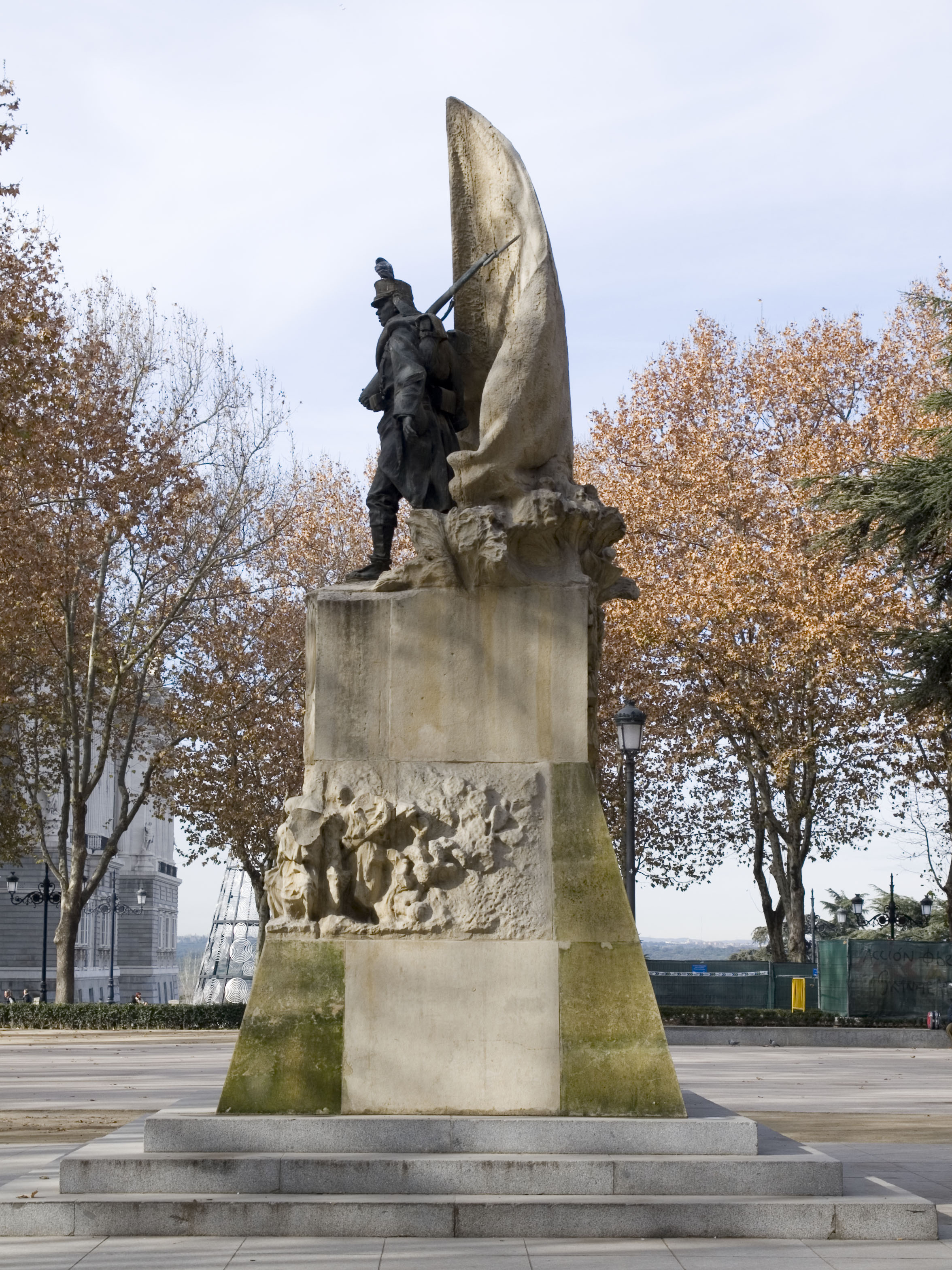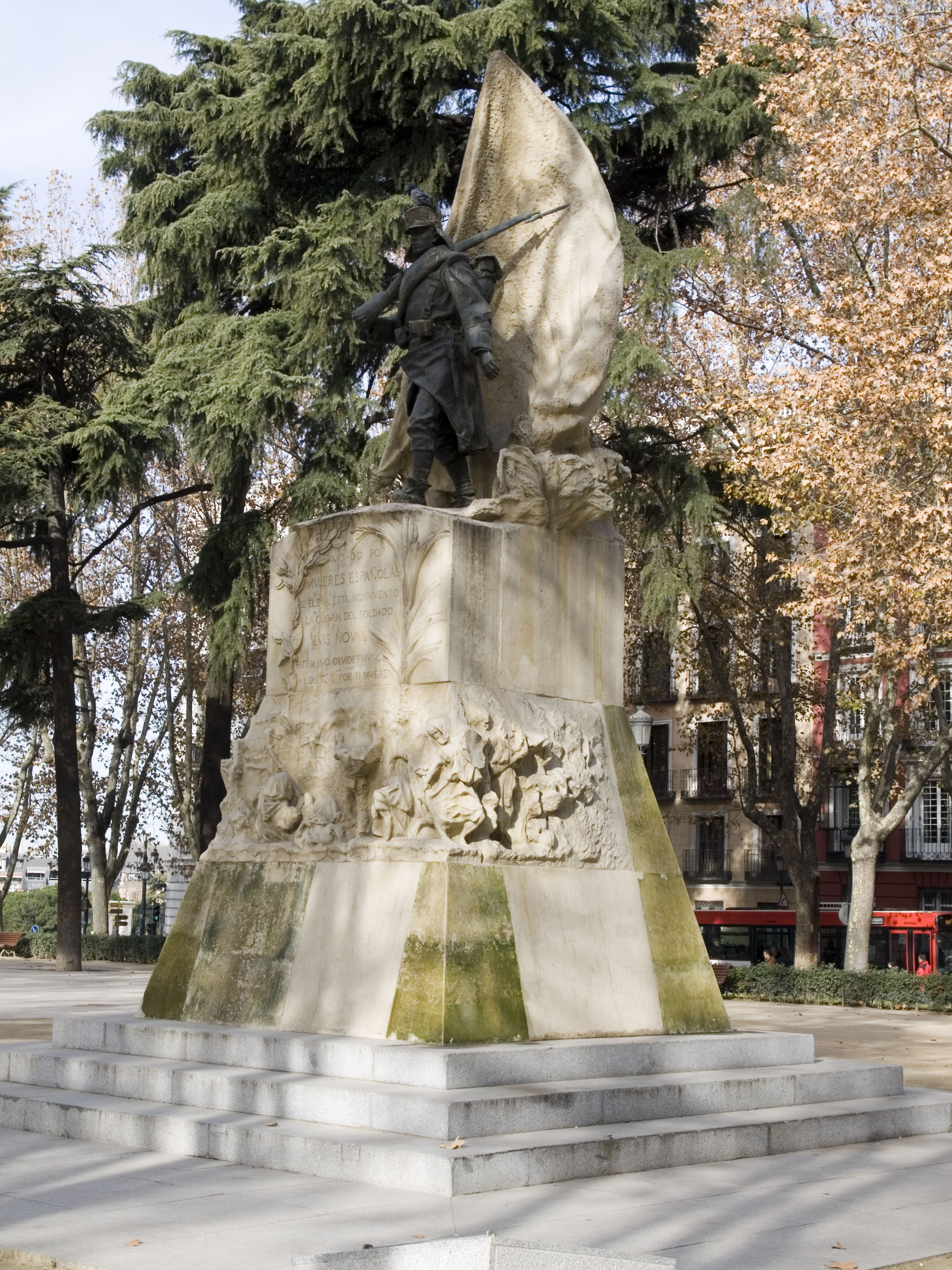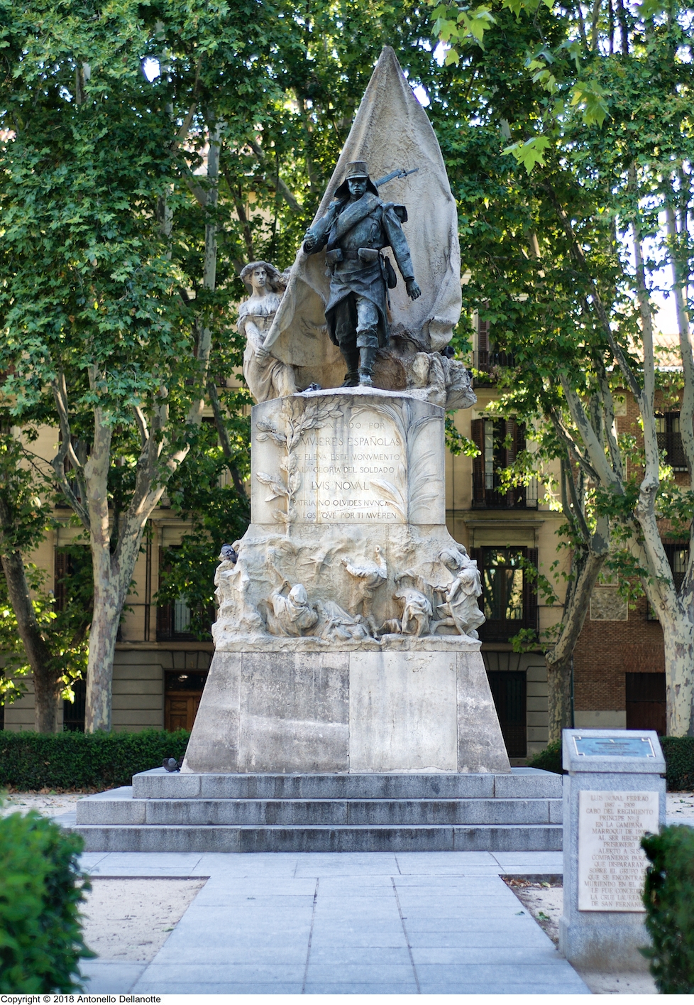 Configuración pedestal | Pedestal muy ornamentado, realizado por Mariano Benlliure , está diseñado en forma de pirámide truncada labrada superpuesta a otra lisa, apoyadas ambas sobre una serie de tres peldaños de granito, en el frente y en lateral derecho se desarrolla un relieve, actualmente muy perdido, en el que se puede vislumbrar la trágica escena de la caída del cabo Noval, que aparece en primer término y de espaldas. A ambos lados, soldados españoles disparan contra los moros que unos mueren otros huyen bajo el humo de los disparos. En la parte central y enmarcada por ramos de palma y laurel aparece una inscripción incisa: INICIADO POR / MVJERES ESPAÑOLAS SE ELEVA ESTE MONVMENTO / A LA GLORIA DEL SOLDADO / LVIS NOVAL / PATRIA NO OLVIDES NVNCA / A LOS QVE POR TI MVEREN. En la parte posterior otra inscripción incisa y rematada por dos ramas de laurel en la parte superior que dice: GRATITVD / COOPERACIÓN D LOS ESPAÑOLES / EN AMBOS CONTINENTES / EN NOMBRE DE LA JVNTA D SEÑORAS / PRESIDENTE HONORARIO S.M. LA REINA / VICTORIA EVGENIA / PRESIDENTE DVQUESA VIVDA D BAILÉN / PRESIDENTE MARQVESA DE ESQVILACHE / DVQVESA D ZARAGOZA / GENERALA MARINA / IGNACIA B D S A PIDAL / MARQVESA DE COMLLAS / MARQVESA D POLAVIEJA / MARQVESA D VADILLO / CONDESA D PEÑALVER / SECRETARIA CONDESA D PARDO BAZÁN / VIII JVNIO D MCMXII. Material: Pétreo (arenisca). Dimensiones: 4,00 x 3,00 x 3,00 m. |