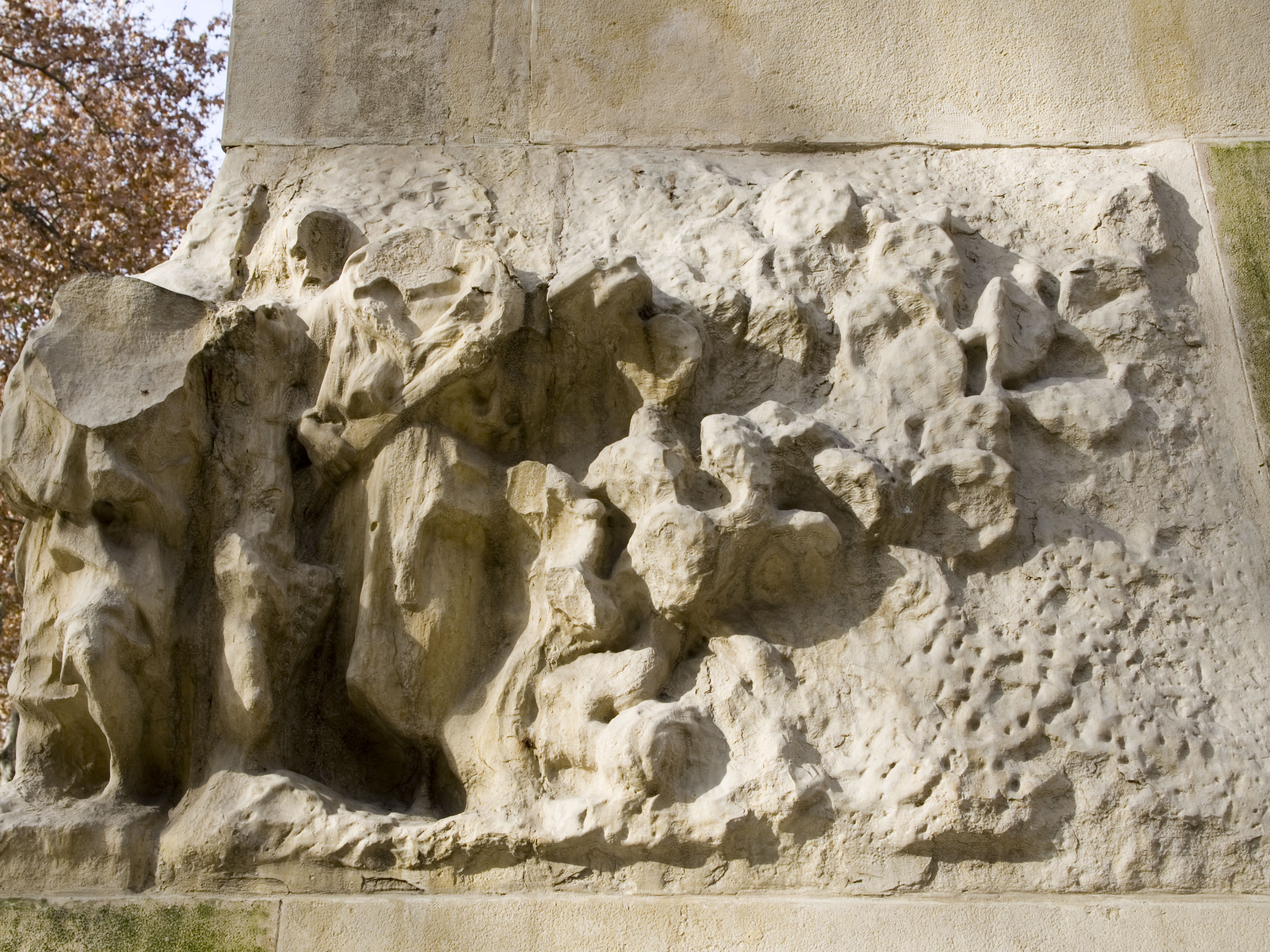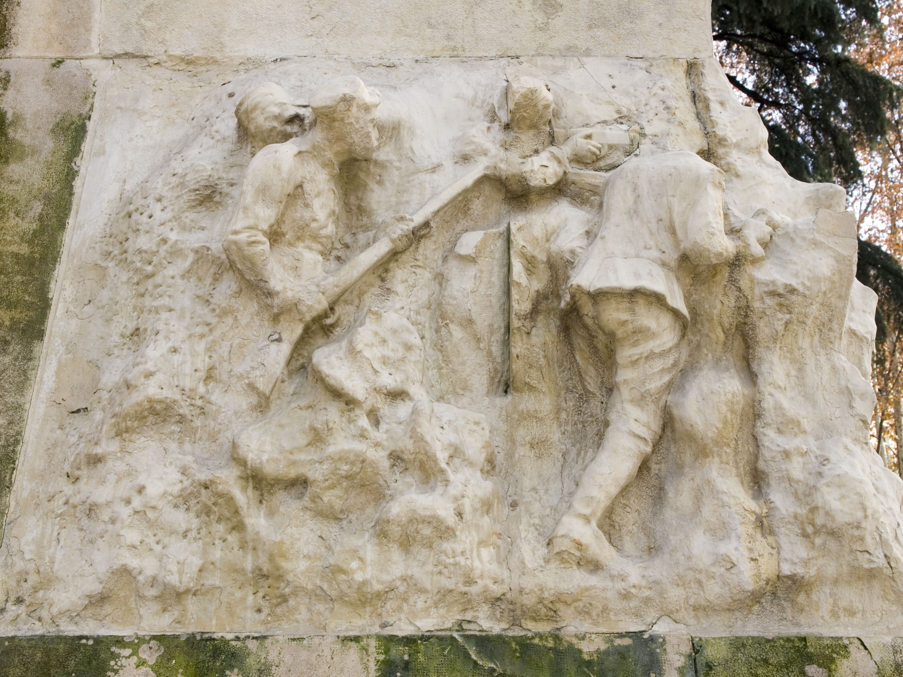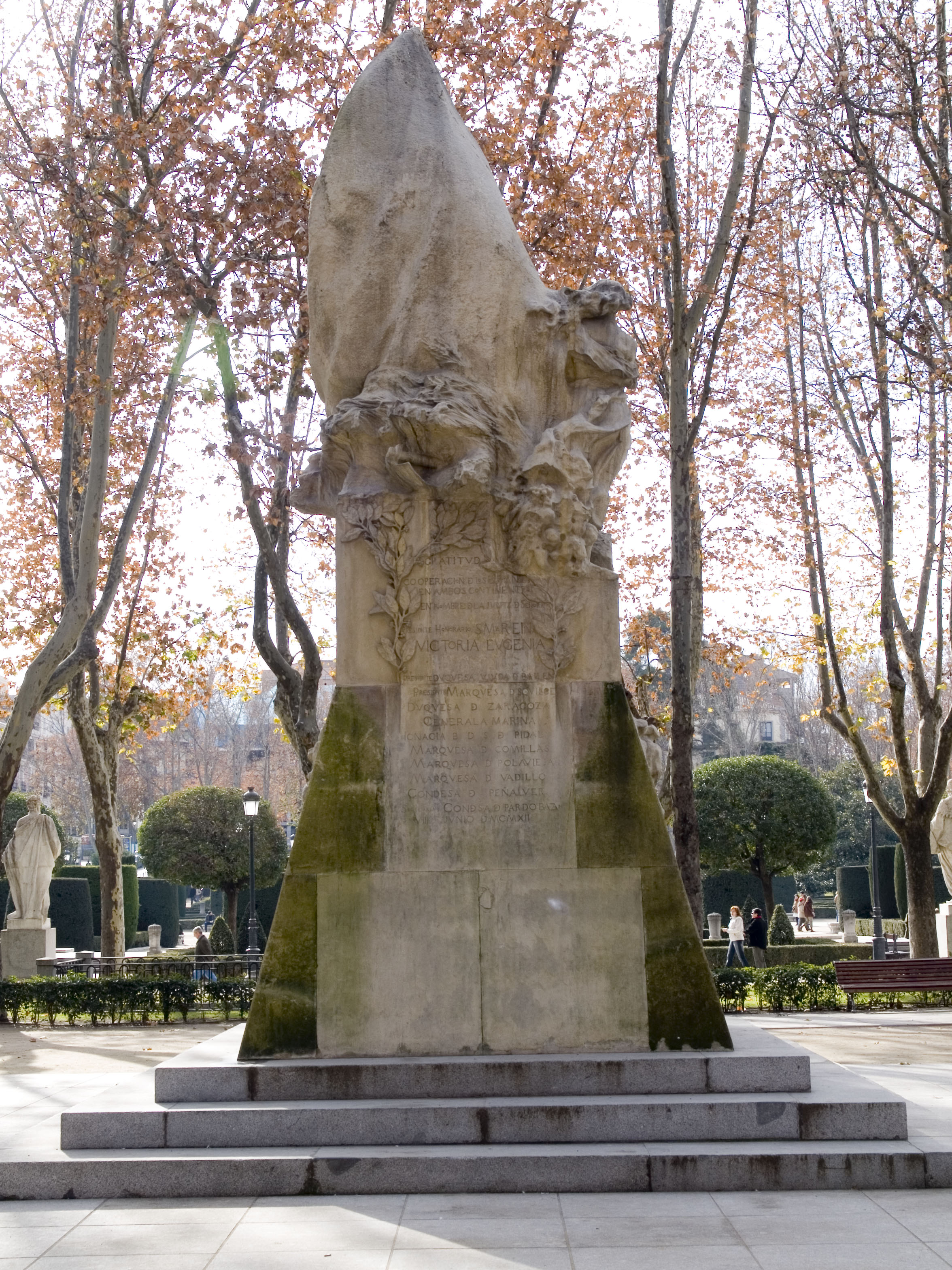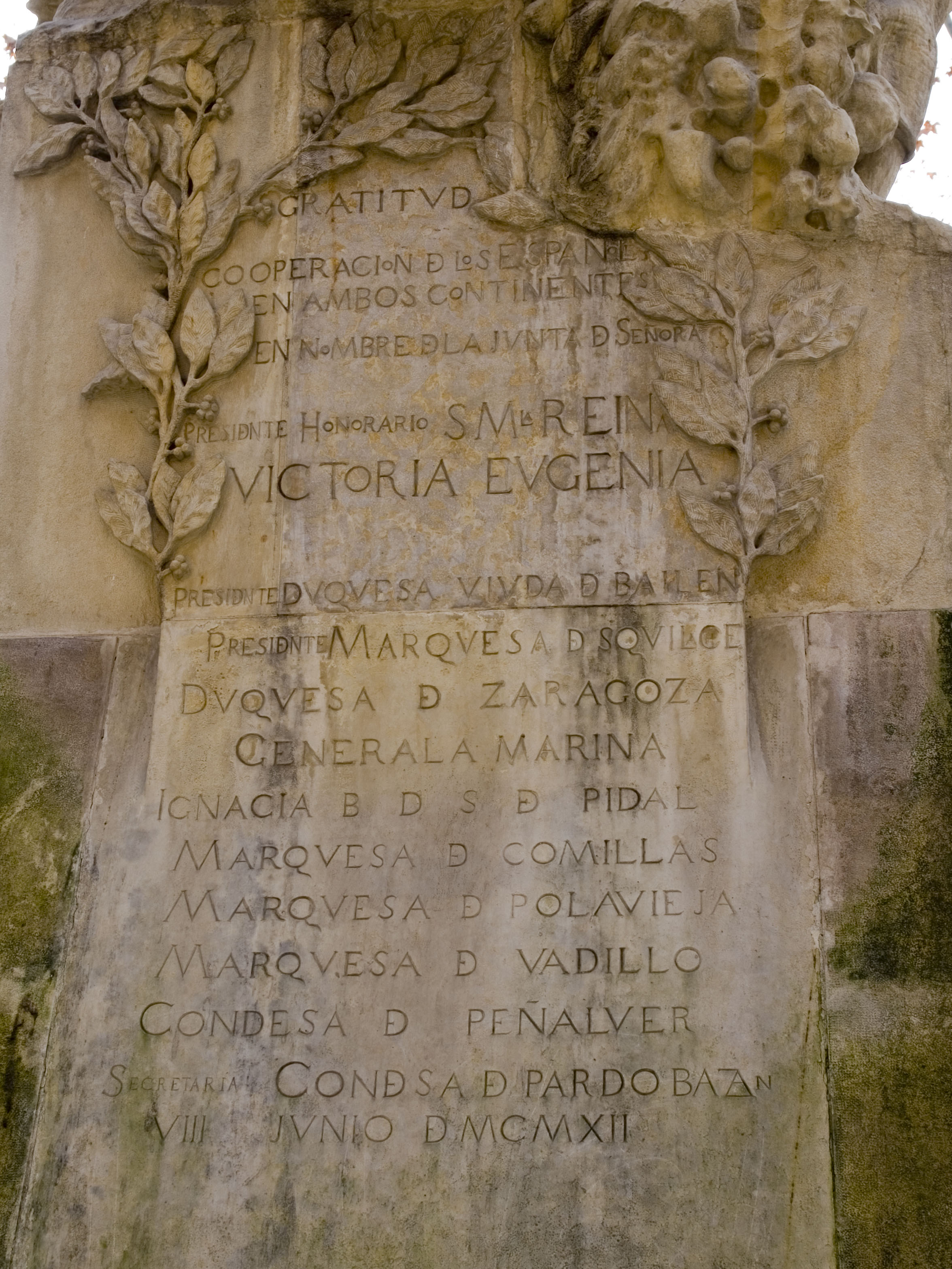 Configuración pedestal | Pedestal muy ornamentado, realizado por Mariano Benlliure , está diseñado en forma de pirámide truncada labrada superpuesta a otra lisa, apoyadas ambas sobre una serie de tres peldaños de granito, en el frente y en lateral derecho se desarrolla un relieve, actualmente muy perdido, en el que se puede vislumbrar la trágica escena de la caída del cabo Noval, que aparece en primer término y de espaldas. A ambos lados, soldados españoles disparan contra los moros que unos mueren otros huyen bajo el humo de los disparos. En la parte central y enmarcada por ramos de palma y laurel aparece una inscripción incisa: INICIADO POR / MVJERES ESPAÑOLAS SE ELEVA ESTE MONVMENTO / A LA GLORIA DEL SOLDADO / LVIS NOVAL / PATRIA NO OLVIDES NVNCA / A LOS QVE POR TI MVEREN. En la parte posterior otra inscripción incisa y rematada por dos ramas de laurel en la parte superior que dice: GRATITVD / COOPERACIÓN D LOS ESPAÑOLES / EN AMBOS CONTINENTES / EN NOMBRE DE LA JVNTA D SEÑORAS / PRESIDENTE HONORARIO S.M. LA REINA / VICTORIA EVGENIA / PRESIDENTE DVQUESA VIVDA D BAILÉN / PRESIDENTE MARQVESA DE ESQVILACHE / DVQVESA D ZARAGOZA / GENERALA MARINA / IGNACIA B D S A PIDAL / MARQVESA DE COMLLAS / MARQVESA D POLAVIEJA / MARQVESA D VADILLO / CONDESA D PEÑALVER / SECRETARIA CONDESA D PARDO BAZÁN / VIII JVNIO D MCMXII. Material: Pétreo (arenisca). Dimensiones: 4,00 x 3,00 x 3,00 m. |