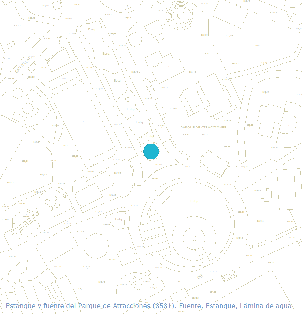 El denominado Estanque del Parque de Atracciones es, de hecho, una espléndida fuente ornamental reducida a un prominente vaso cilíndrico alzado en el eje del Lago y en el último, o bien primero e inicial tramo superior, de la secuencia de terrazas en cascada que conforman el mismo hasta alcanzar la base de la Gran Avenida o columna que vertebra el conjunto del parque. El vaso arranca de una simulación de aglomerado natural rocoso con mampuestos de caliza, a modo de raíces que anclarían al suelo el pilón cilíndrico de cemento, de gran desarrollo vertical para acentuar su valor axial y su presencia detonante en la cota superior de las cascadas del Lago. Culmina el vaso un elemento perimetral volado, a modo de singular albardilla, con sección configuradora de un canal interior y perimetral y de un perfil más exterior que facilitan el intenso rebosamiento, de gran efecto visual, de las aguas de la fuente, recogidas a su vez del conjunto de surtidores emergentes de la superficie superior del vaso, que cruzan entre sí los chorros impulsados y están dispuestos en tres anillos circulares concéntricos de diámetro creciente.