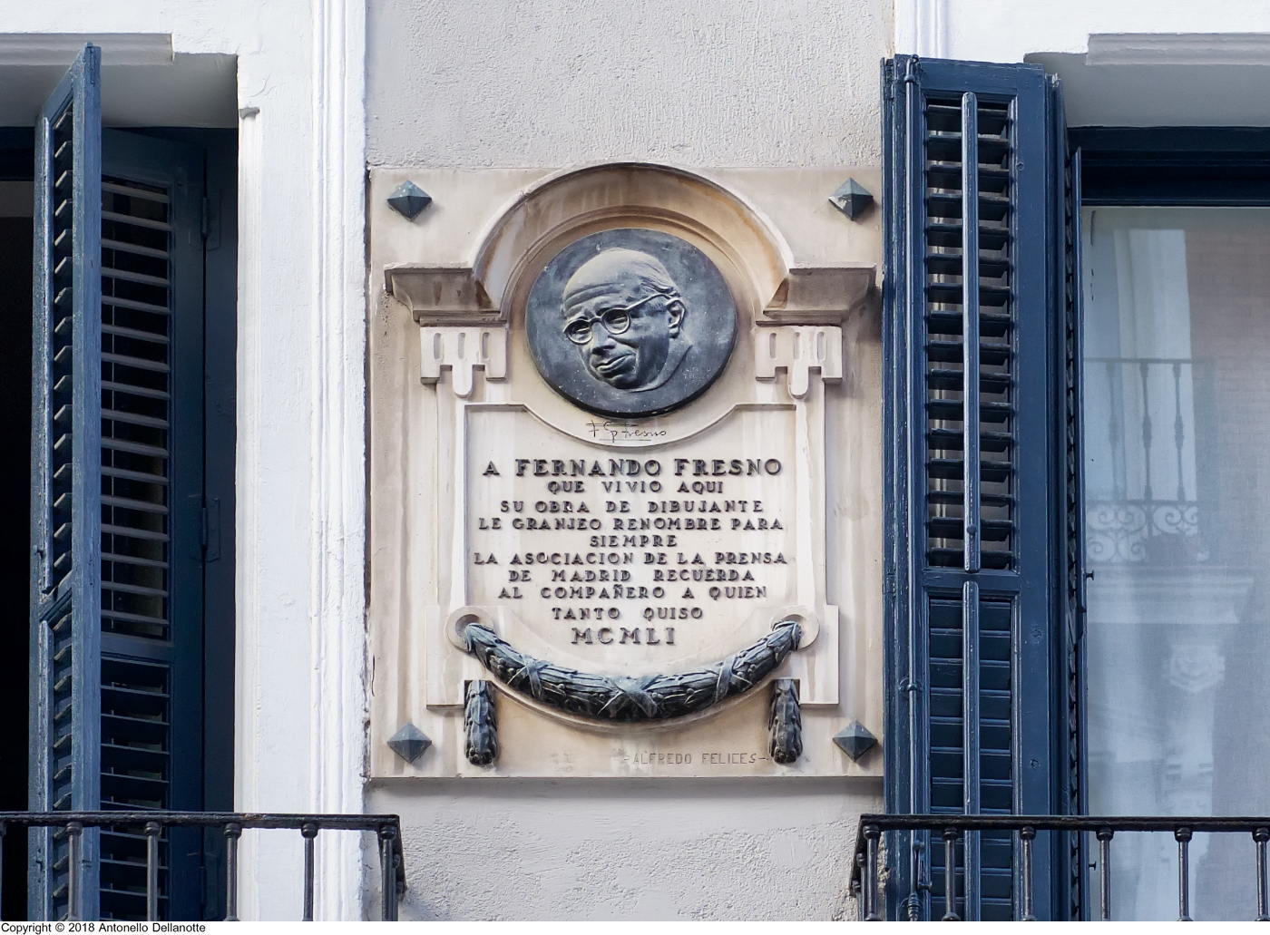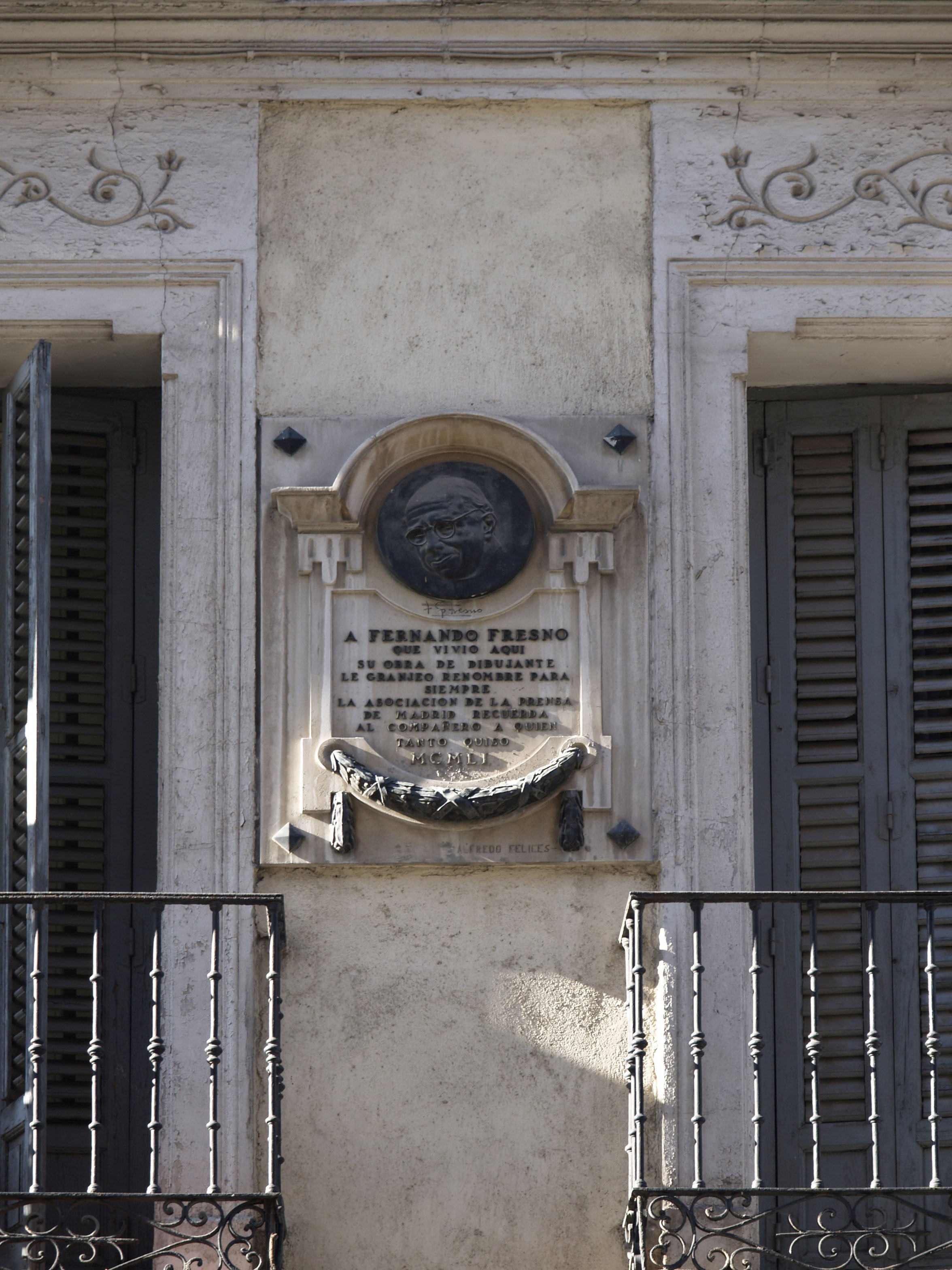 Lápida dedicada a Fernando Fresno, con la efigie en bronce y la inscripción incrustada con letras en bronce: A FERNANDO FRESNO / QUE VIVIÓ AQUÍ / SU OBRA DE DIBUJANTE / LE GRANJEO RENOMBRE PARA / SIEMPRE / LA ASOCIACIÓN DE LA PRENSA / DE MADRID RECUERDA / AL COMPAÑERO A QUIEN / TANTO QUISO / MCMLI.