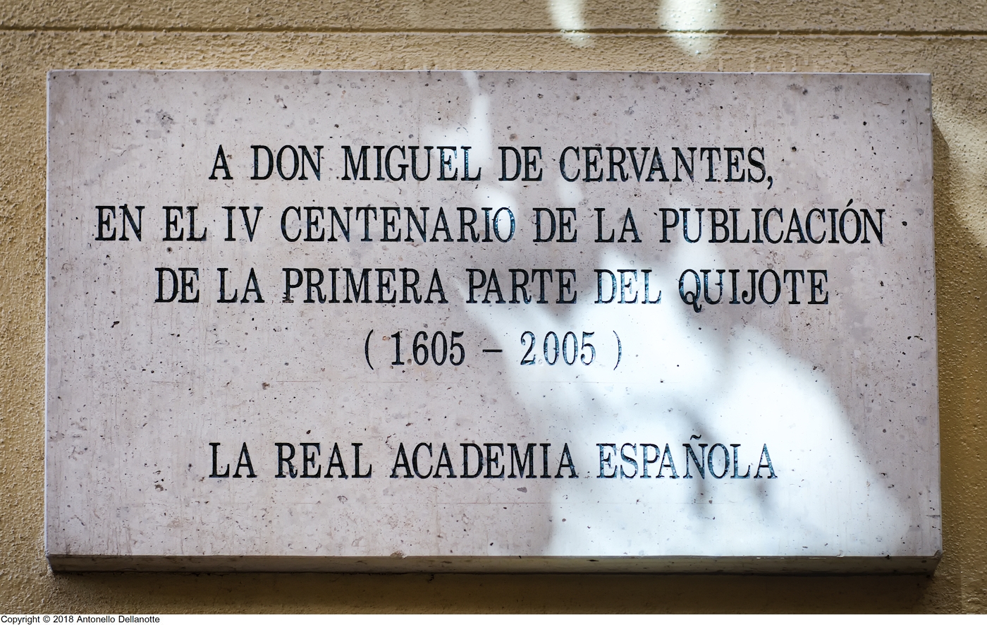 Sencilla lápida, con inscripción incisa y pintada en negro: A DON MIGUEL DE CERVANTES, / EN EL IV CENTENARIO DE LA PUBLICACIÓN / DE LA PRIMERA PARTE DEL QUIJOTE / (1605 2005) / LA REAL ACADEMIA ESPAÑOLA.
