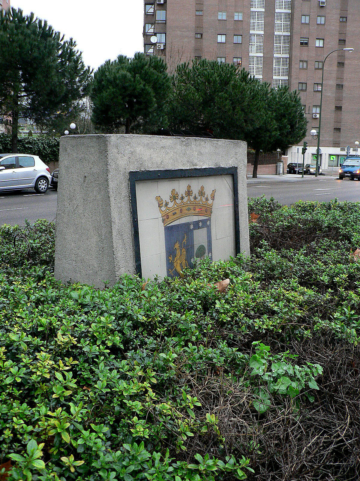 Pilonas de aproximadamente 1,10 m de altura, que están realizadas de albañilería de ladrillo enfoscado de cemento y pintado de blanco, cuyo perfil es trapezoidal y caras frontales cuadradas. En sus dos caras opuestas lleva una ventana de 80 x 80 cm con marco de hierro pintado de negro, que sujeta una placa de metacrilato transparente, tras la cual se divisa una composición de cinco por cinco azulejos esmaltados con motivos heráldicos alusivos a los escudos históricos de la ciudad de Madrid. Están colocados en la mediana del tramo final de Arturo Soria, y se hallan dotados de iluminación por reflectores colgados de las farolas situadas en las aceras opuestas.
