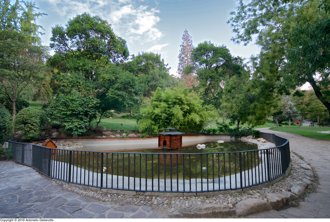 Estanque irregular de formas curvas y sinuosas, vallado en todo su perímetro con barandilla metálica y sin bordillo, excepto en la orientación noroeste, donde la pendiente obliga a crear un pequeño murete de contención, construido en ladrillo.