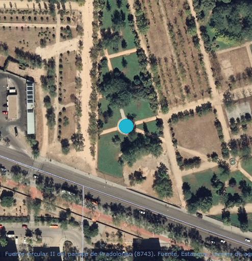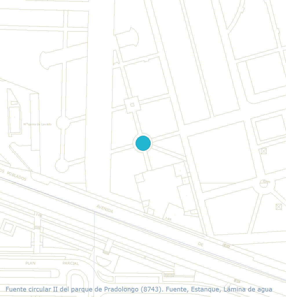 Fuente circular situada en un placita de la zona sur del parque de Pradolongo. Esta compuesta por una serie de piezas o sillares de piedra artificial y tiene numerosos surtidores perimetrales.