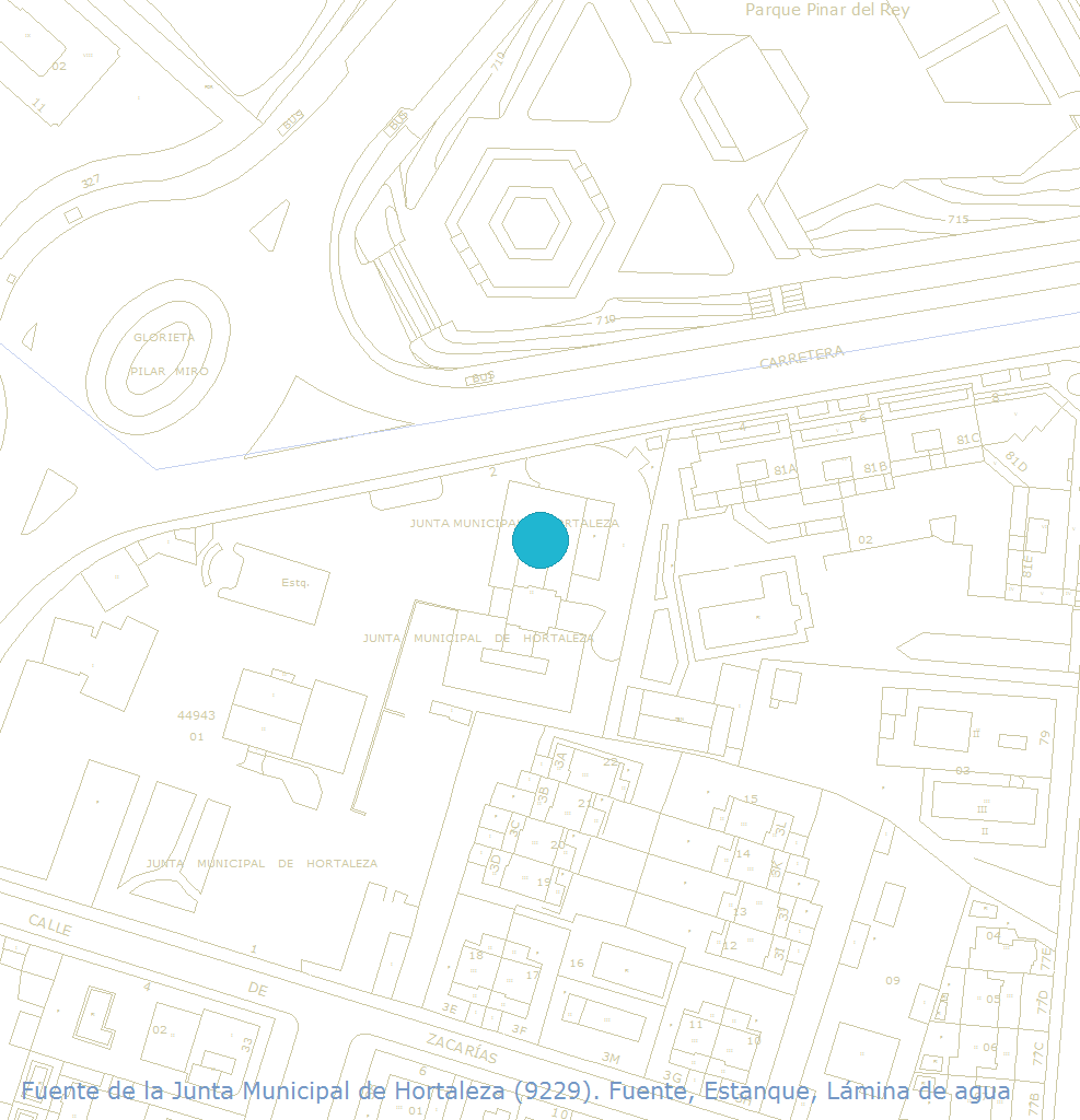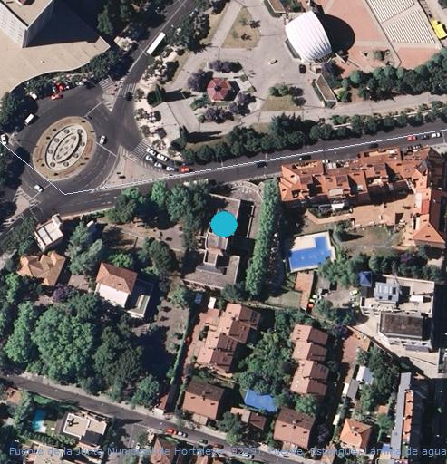 Sencilla lámina de agua, de forma sensiblemente rectangular, que adorna el patio interior del nuevo edificio de la Junta Municipal del Distrito de Hortaleza enlazando compositivamente con el edificio de modo adecuado. El estaque está rodeado por un solado, de forma también rectangular, realizado con adoquines de hormigón y cerrado con un bordillo de cemento.